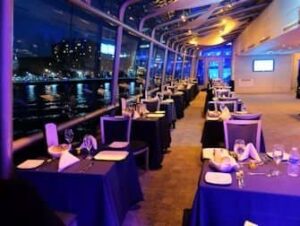 Tijdens de dinner cruise in New York worden er meerdere gangen aan tafel geserveerd. Deze bestaan uit een charcuteriebord, een salade, zeevruchten, een hoofdgerecht en een desert. Ook is er een ruime selectie non-alcoholische drankjes beschikbaar, die inbegrepen zitten bij de prijs. Er zijn alcoholische dranken beschikbaar waar u voor moet bijbetalen. Gedurende het eten kunt u genieten van de live muziek en heeft u genoeg tijd om rond te lopen om zo bijvoorbeeld ook het buitendek te verkennen.