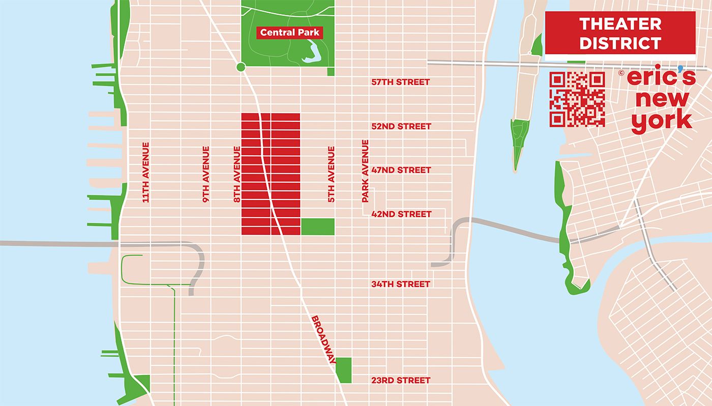 De theaters binnen dit gebied zijn op te delen in twee categorieën: Broadway en Off-Broadway. Hierbij gaat het niet letterlijk om de locatie, maar om het soort theater en de grootte van de show. Off-Broadwayshows bieden plaats aan honderd tot vijfhonderd mensen en zijn dus kleinschalige, vaak wat experimentele, gedurfdere producties. Daartegenover staan de Broadwayshows; kaskrakers die doorgaans jarenlang draaien en waarbij meer mensen terecht kunnen. Denk aan bekende musicals zoals The Lion King, Hamilton en Chicago. Bijna alle veertig officiële Broadwaytheaters liggen rond de straat Broadway, in Manhattan. Leuk weetje: als de Broadwayshow niet in een van die theaters wordt opgevoerd, maakt het stuk ook geen kans op een Tony Award!